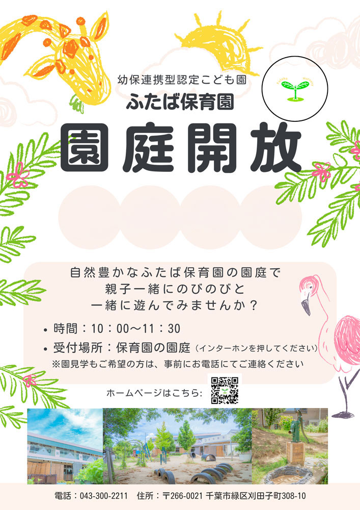 イベント 園庭開放 保育園の園庭で、親子で一緒に遊びませんか? 保育園の園庭で、親子で一緒に遊びませんか?インターホンを鳴らしてお入りください 日程は下記のカレンダーをご確認ください! 読み込み中... 幼保連携型認定こども園 ふたば保育園・令和8年度 募集要項【1号認定】 前の記事 小・中・高校生 夏期・保育体験のご案内 次の記事